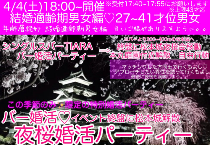 【公式サイト☆ベストレート早割先行予約✨4月婚活バー結婚適齢期編】4/4(土)18:00~年に一度の特別イベント!最後に松本城夜桜会へ《結婚適齢期男女編♡27~41才位男女主役》バー婚活&松本城夜桜婚活パーティー