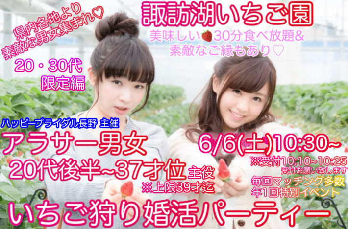 【公式サイト☆ベストレート早割先行予約✨6月度20・30代いちご狩り婚活】 6/6(土)10:30~今年もやります☆いちご狩りコン【女性様早割千円♪】諏訪湖いちご園《20・30代限定アラサー男女編》いちご狩り婚活パーティー