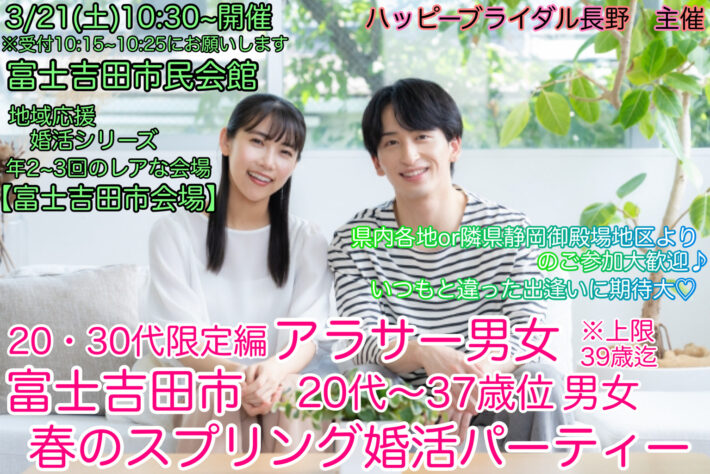 【公式サイト☆ベストレート早割先行予約✨3月富士吉田市20・30代婚活】 3/21(土)10:30~【富士吉田民会館】20・30代限定編《アラサー男女20代~37才位》富士吉田市♡春のスプリング婚活パーティー