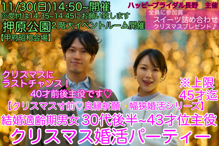 【公式サイト☆ベストレート早割先行予約✨11月甲府昭和30・40代編婚活】11/30(日)14:50~上限45才迄《結婚適齢期30代~43才位男女主役》素敵な恋人候補が集まる♡クリスマス婚活パーティー