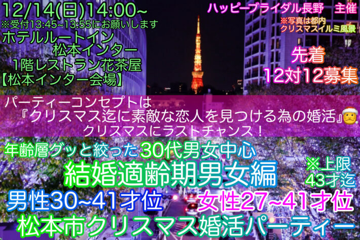 【公式サイト☆ベストレート早割先行予約✨12月松本市30代中心編婚活】 12/14(日)14:00~【ルートイン松本IC会場】上限43歳迄《結婚適齢期男女♡30代〜41歳位主役》松本市クリスマス婚活パーティー