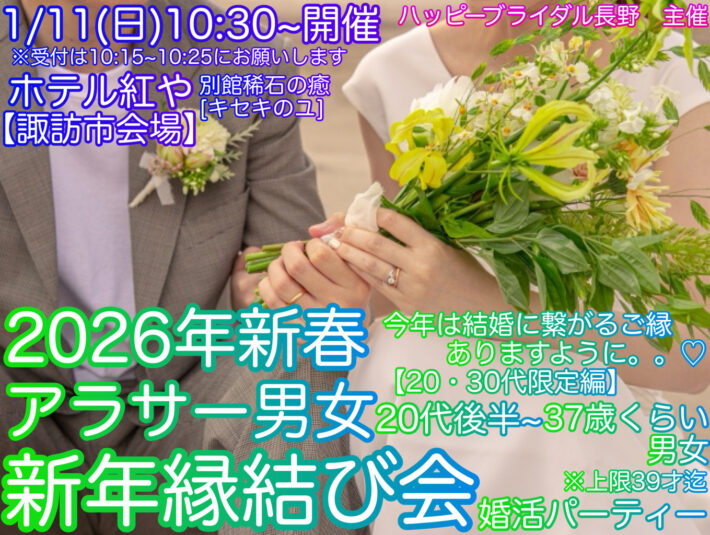 【公式サイト☆ベストレート早割予約✨諏訪市1月度20・30代婚活】1/11(日)10:30~ 2026年第一弾【諏訪市会場】20・30代限定編《アラサー20代後半〜37才位》新年縁結び会♡婚活パーティー