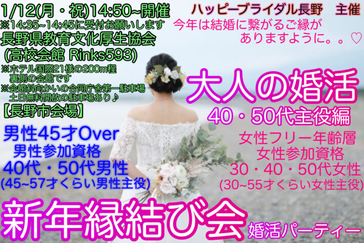 【公式サイト☆ベストレート早割先行予約✨1月長野市40・50代編】 1/12(月・祝)14:50~2026年第一弾【長野市会場】大人の婚活《男性→45才Over40・50代♡女性→フリー30・40・50代》新年縁結び会婚活