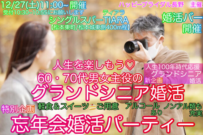 【公式サイト☆ベストレート早割先行予約✨12月度松本市シニア編忘年婚活】 12/27(土)11:00~松本東町♡【婚活バーTIARA】今流行りのシニア編(忘年飲み会)《新企画の60・70代男女主役》グランドシニア忘年会婚活パーティー