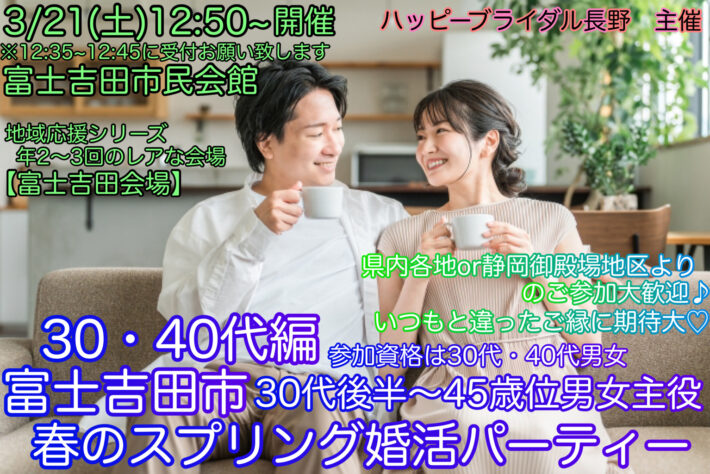 【公式サイト☆ベストレート早割先行予約✨3月富士吉田市30・40代婚活】 3/21(土)12:50~ 【富士吉田民会館】30代・40代編《アラフォー30代後半~45才位男女主役》富士吉田市♡春のスプリング婚活パーティー