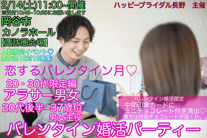 【公式サイト☆ベストレート早割先行予約✨2月岡谷市20・30代編婚活】 2/14(土)11:00~バレンタイン婚活シリーズ【岡谷市会場♡第1部】20・30代限定編《アラサー男女編20代後半〜37歳位》バレンタイン婚活♡諏訪圏会場