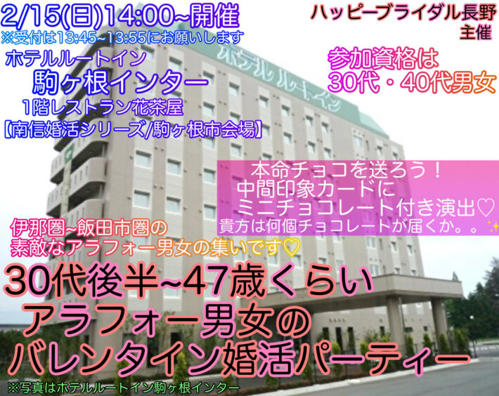 数少ない南信婚活パーティー❤️恋人が欲しいアラフォー男女は2/15(日)ルートイン駒ヶ根ICに集まれ