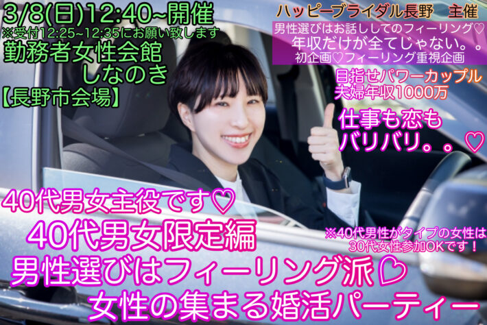 【公式サイト☆ベストレート早割先行予約✨3月長野市40代男女婚活】 3/8(日)12:40~初企画【長野市会場♡第2部】男は年収や学歴だけじゃないよ!《40代男女限定編》男性選びはフィーリング派♡女性の集まる婚活パーティー