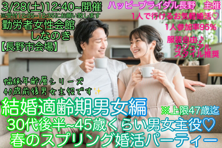 【公式サイト☆ベストレート早割先行予約✨3月長野市30・40代結婚適齢期編婚活】 3/28(土)12:40~出逢いの春【長野市会場】30代・40代編/上限47歳迄《結婚適齢期編♡30代後半~45歳位男女主役》春のスプリング婚活パーティー