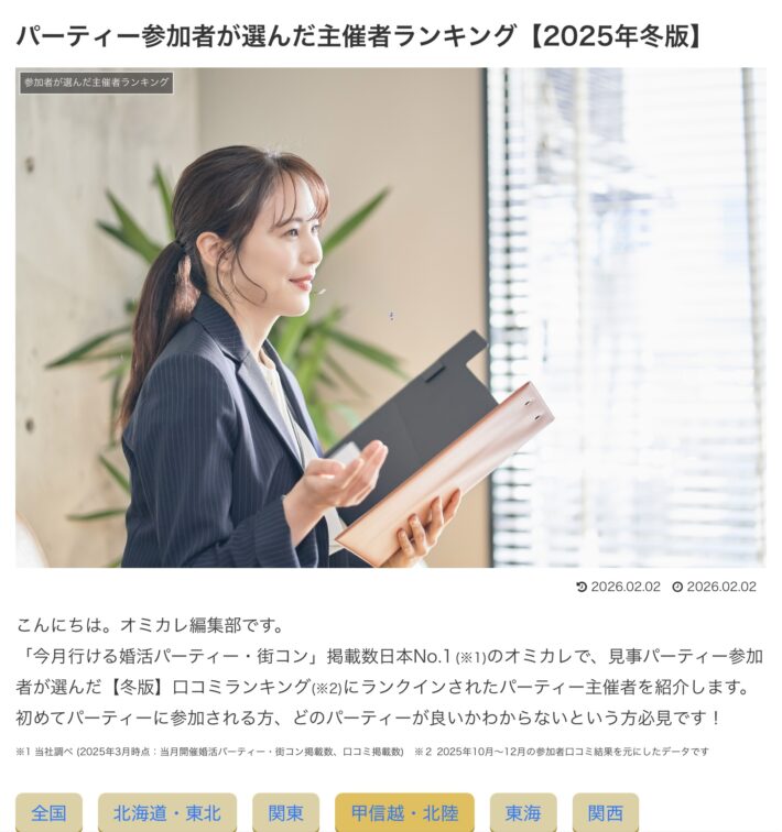 2026・2・2婚活パーティー情報サービス『オミカレ』お客様口コミ評価にて北陸・甲信越地区第4位となりました✨