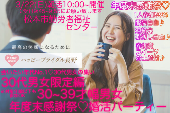 【公式サイト☆ベストレート3月松本市会場/30代男女限定編】3/22(日)10:00~【松本市会場/松本市勤労者福祉センター】《30代男女限定編♡30~39才幅主役》年度末感謝祭♡婚活パーティー