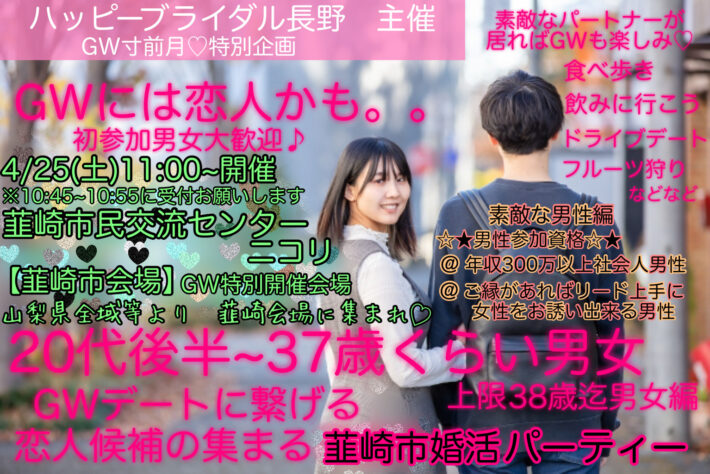 【公式サイト☆ベストレート早割先行予約✨4月度韮崎20・30代婚活】4/25(土)11:00~【韮崎市民交流センター】上限38才迄《アラサー20代~37才位男女》恋人候補の集まる♡韮崎市婚活パーティー