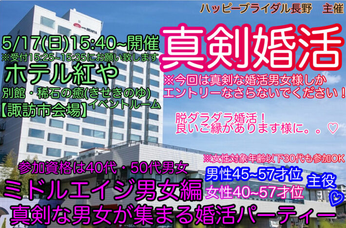 【公式サイト☆ベストレート早割予約✨諏訪市5月度40・50代婚活】5/17(日)15:40~紅やで婚活♡【諏訪市会場】参加資格40代・50代《45~57才位男女主役♡ミドルエイジ編》真剣なミドル男女が集まる婚活パーティー