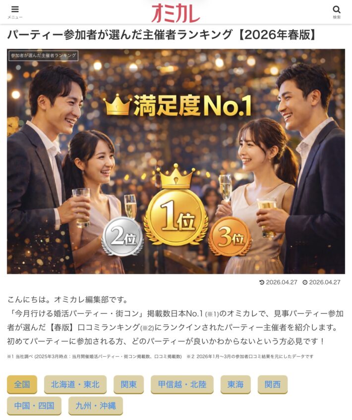 2026・4・28婚活パーティー情報サービス『オミカレ』お客様口コミ評価にて北陸・甲信越地区第2位となりました✨